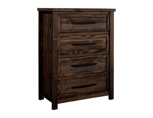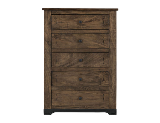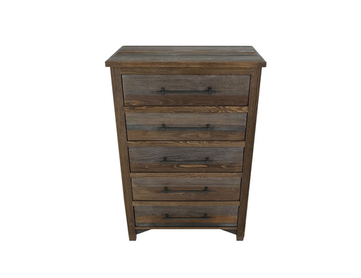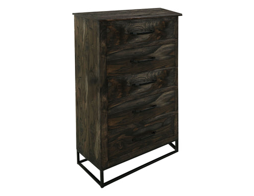 IFD Group5 Drawer Chest. The Loft Brown Collection is constructed using pine wood that has been hand-stained and distressed, complemented by hand-forged iro...