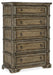 With a down-to-earth craftsman-like character evoking the neutral color tones of the open prairie, the Ross Prairie Five-Drawer Chest combines a distinctive case front design with framed drawers and key-latch shaped ring-pull hardware in a gunmetal color. Chunky feet and architectural corner brackets bring flair to this focal point piece for your bedroom refuge. The top drawer has a drop-in felt liner, and the bottom drawer is cedar-lined. Crafted of Poplar and Hardwood Solids with rustic Oak Veneer and with a solid wood edge on the top, the chest is finished in Washoff, a dry medium wood tone with distressing inspired by antiques.
