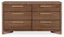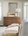The Eleana Dresser exudes timeless sophistication with its Light Caramel walnut veneer finish and plated Sunlit Bronze hardware. Designed with six self-closing drawers, a jewelry tray, and cedar-lined bottom drawers, it offers elegant organization. Soft, rounded corners enhance its sculptural silhouette, making it a standout piece for transitional bedrooms.