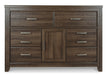 Details Made of engineered wood (MDF/particleboard) and decorative laminate, Vintage aged brown rough sawn finish over replicated oak grain, Pewter-tone hardware, 6 drawers, 1 cabinet with 1 adjustable shelf, Mirror attaches to back of dresser, Safety is a top priority, clothing storage units are designed to meet the most current standard for stability, ASTM F 2057 (ASTM International), Drawers extend out to accommodate maximum access to drawer interior while maintaining safety, Assembly required