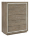 In a crisp two-tone finish combining a gray washed oak with a contrasting textured light gray color, the Serenity Five-Drawer Chest brings the organic textures of cottage waterfront living to your space. Crafted of Oak Veneers and resin, the drawers have soft-close drawer guides, the top drawer has a removable black felt liner and the bottom drawer is cedar-lined.