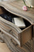 Castella Three Drawer Nightstand brings together classic style elements and a refined rustic finish in an impassioned marriage of casual opulence. Exuberant design motifs such as an acanthus leaf molding around the base, column motifs on the edge of the case and ornate bun feet infuse the piece with emotion. The Antique Slate finish in beautiful patinas has a luminous and fresh appeal. The three drawers include a cedar-lined bottom drawer. On the back is a convenient receptacle and USB port for use with electronic devices, and a light that illuminates from the bottom of the nightstand offers ambience.