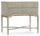 Curvy and elegant, the Elixir Two-Drawer Nightstand combines metal trim and a metal X-stretcher in a champagne silver finish with a serene gray beige finish applied to lightly sand-blasted walnut veneer for textural appeal.