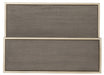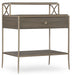 The delicately-scaled Elixir Leg Nightstand combines metal elements in a champagne silver finish with a soft gray finish applied to lightly sand-blasted walnut veneer for an organic and textured look. One drawer and two shelves. Faux shagreen is on the knob for a touch of intrigue.