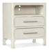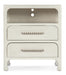 Inspired by casual waterfront living with a chic sophistication, the Serenity Nightstand is crafted of Wood and Raffia and finished in Sand Dollar, a white lacquered grasscloth. Chow-style legs and light champagne-colored decorative bar pulls add a designer touch. The two drawers have soft-close drawer guides, and there’s one open area above the drawers. There’s a USB charger with two ports and a cord clip on the back.