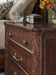 Taking inspiration from the tropical craftsmanship of botanical carving and woven cane accents of classic British and Dutch Colonial design, the Charleston Nightstand is crafted of Cherry and Walnut Veneers, Walnut Inlay and Cane with a Solid Wood top. All 3 self-closing drawers have cane insets, and the two front posts are adorned with botanical carving. There are two USB ports and chargers on the back, along with a cord clip. The nightstand is finished in Maraschino Cherry using natural grain Cherry Veneers showcasing a dramatic cathedral structure with naturally occurring knots to deliver a rich warm finish and a smooth sophisticated aesthetic. The round knob and bar pull hardware has an antique bronze finish.