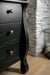 Vintage and romantic, the five-drawer bureau's softly curved front and chunky feet hearken back to a kinder, simpler time. Crafted of Poplar and Hardwood Solids with Maple Veneer, the top two drawers have a drop-in felt liner and the bottom drawers are cedar-lined. The exquisite black finish is multi-layered, with the appearance it has aged gracefully through generations.