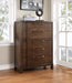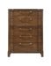 Modern bedroom styling in a Chest constructed with the craftsmanship you will appreciate. The Milan Chest features a warm brown walnut-colored finish accented by the contemporary sloped hardware finished in an antiqued bronze color. The modern breakfront face features an opulent sunburst veneer pattern and side-drawer glides for whisper smooth drawer operation.