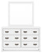 | Details | B427B6: Includes queen panel headboard, footboard, rails and slats, Made with hardwood solids, okoume veneer and MDF substrates, White finish, Foundation/box spring required, sold separately, Mattress available, sold separately, Assembly required, B427B1: Includes dresser and mirror, Made with hardwood solids, okoume veneer and MDF substrates, White finish, 6 drawers with dovetail construction and metal center guides, Hardware with dark finish, Drawer interiors are lined with a wood grain laminate for a clean, finished look, Mirror attaches to back of dresser, B427-92: Made with hardwood solids, okoume veneer and MDF substrates, White finish, 2 drawers with dovetail construction and metal center guides, Hardware with dark finish, Drawer interiors are lined with a clean wood grain laminate for a clean, finished look, | |