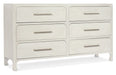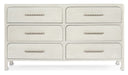 Inspired by casual waterfront living with a chic sophistication, the Serenity Dresser is crafted of Wood and Raffia and finished in Sand Dollar, a white lacquered grasscloth. Chow-style legs and light champagne-colored decorative bar pulls add a designer touch. The six drawers have soft-close guides, and the top left drawer has a removable black felt liner. The top right drawer has a removable black felt liner and sliding/removable black felt jewelry tray and the bottom drawers are cedar lined.