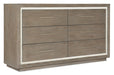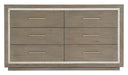 In a crisp two-tone finish combining a gray washed oak with a contrasting textured light gray color, the Serenity Mainstay Dresser brings the organic textures of cottage waterfront living to your space. Crafted of Oak Veneers and Resin with Cedar, there are six soft-close drawers with soft-close drawer guides and the top left drawer offers a removable black felt liner. The top right drawer has a removable black felt liner and sliding/removable black felt jewelry tray. The bottom drawers are cedar-lined.