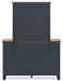 Details B414B2: Includes panel headboard, footboard, rails and slats, Made with hardwood solids, mindi wood veneer and MDF substrates, Two-tone finish features a dark slate blue with a light brown wood-tone top, Foundation/box spring required, sold separately, Mattress available, sold separately, Assembly required, B414B1: Includes dresser and mirror, Made with hardwood solids, mindi wood veneer and MDF substrates, Two-tone finish features a dark slate blue with light brown wood-tone top, Nickel-tone metal knobs, 6 drawers with fully finished interior, dovetail construction and heavy duty ball-bearing side glides, Mirror attaches to back of dresser, B414-92: Made with hardwood solids, mindi wood veneer and MDF substrates, Two-tone finish features a dark slate blue with a light brown wood-tone top, Nickel-tone metal knobs, 2 drawers with fully finished interior, dovetail construction and heavy duty ball-bearing side glides,