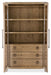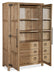 Inspired by California wine country and influenced by the craftsman architecture of the region, the stunning Vineyard Row Wardrobe is a striking and functional focal-point piece. Crafted of Pecky Hickory and White Oak Veneers with window-pane-designed door fronts, it is finished in the light and airy Sonoma, reminiscent of the crisp white wines of the Sonoma region. The two doors have mirror glass on the backs. One removable clothing rod, two adjustable wood shelves, three self-closing drawers and a top drawer with a removable black felt-lined jewelry tray and one partition are behind the doors. The center drawer has removable black felt liner. Rustic hammered metal accents and bar and ring pulls add to the craftsman appeal.
