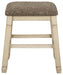 The beauty of this upholstered bar stool is something to savor. Designed to serve up comfort and flair, this backless bar stool entices with a saddle seat covered in a heavy woven fabric that complements the antiqued white finish.