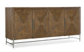Craftsman style gets a casual modern twist with the Chapman Buffet, constructed of White Oak Veneers with a warm brown Sorrel finish revealing the woodgrain and a refined decorative veneer pattern. Custom hardware in a forged pewter finish is complemented by a thinly-scaled metal base and stretcher. Featuring 4 doors with soft-close hinges, there is one drawer and one adjustable shelf behind each pair of doors, and the left drawer has a removable felt lined silverware tray. Ventilated back panel.