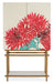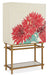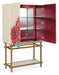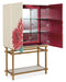 Pretty and polished, the Patrisha Bar Cabinet is a lovely, uplifting focal point packed with storage function. The cabinet has two linen-wrapped, handpainted doors and two adjustable glass shelves behind the doors, along with a mirrored back panel and a puck light in top. Crafted of wood and linen and tempered glass, the cabinet has a red interior with a gold metal base and gold pendant pulls.