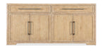 Serene and stylish with a modern twist, the Retreat Buffet offers a delightful mix of natural materials in a clean and sleek silhouette. The case is crafted of Oak and Maple Veneers with a Travertine Stone inlay top and a sand-colored Dune finish to showcase the unique grain patterns of the wood. The four doors have magnetic door catches and one adjustable shelf behind each. The two drawers have self-close drawer guides, and the top left drawer has a removable felt liner, while the top right drawer has a removable silverware tray. The textured, pewter-colored bar pulls add a dramatic accent.