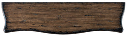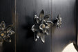 Absolutely captivating, the Bien Ame Buffet is a luxurious piece that is approachable and inviting. With classic bones, the 3-door buffet features a shaped apron and cabriole legs and delightful decorative floral hardware. Crafted of Poplar and Hardwood Solids with Oak Veneers, it is finished in Porte Noir, a black paint with rich brown undertones with areas of heavy rub through and distressing to reveal a honey tone wood color. Doors have soft-close hinges, and there is one adjustable shelf behind each door.