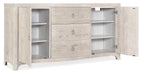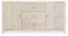 In a light and airy whitewashed and wire brushed oak finish and a soft serpentine-shaped case, the Serenity Buffet brings the relaxed aura of the outside in. The buffet has 2 doors with soft-close hinges and 3 drawers with soft-close drawer guides. The top drawer has a removable black felt silverware tray, and there are 2 adjustable shelves behind each door. Champagne drawer pulls add a sophisticated touch.