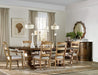 Inspired by French antiques and influenced by classic farmhouse design, the Archivist Trestle Table is an inviting gathering table for welcoming family and friends alike. The classic pedestal bases and top are finished in a soft casual brown over Pecky Pecan, for a rustic authentic look. With two 18-inch leaves, the table extends to 122 inches long to accommodate two arm chairs and six side chairs for large gatherings. Without the leaves, the table will accommodate two arm chairs and four side chairs.