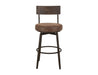 Barstool. Elevate your special space with our modern industrial bar stool, designed for both style and comfort. The seat is upholstered in faux leather, offering a sleek brown finish that enhances any decor while providing a comfortable sitting experience. The backrest features an elegantly curved wooden panel, adding a warm, natural touch to the stool's contemporary aesthetic. Crafted with a sturdy metal frame, this bar stool ensures durability and stability for everyday use. With four sleek and robust metal legs arranged in a slightly flared design, it provides added stability, making it the perfect addition to your kitchen, dining area, or bar. Transform your seating arrangement with this stylish and functional piece.