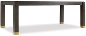 Sleek shapes and clean lines combine with a rustic deep brown Midnight finish on White Oak Veneers for a curated chic modern look in the Curata rectangle dining table. With both 20-inch leaves included, the table extends to 122 inches long and will seat 10 guests. The brushed brass feet are the finishing designer touch.