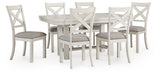 | Details | D642-01: Made with solid wood frame, Antiqued white finish with grain texture, Light gray polyester upholstery, Nailhead trim, X-back, Assembly required, D642-45: Made with rubberwood solids, ash veneer and MDF substrates, Antiqued white finish with grain texture, Tabletop with planked effect, Two 12" removable center leaves, Table extends to 86" overall by pulling both ends and dropping in leaves, Seats up to 8, Assembly required, | |