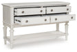 Transform your home into a haven of timeless elegance with this dining server. It pairs a classic antiqued white finish with reeded legs for traditional styling. Four drawers with fully finished interiors offer spacious storage for essentials. The large shelf is perfect for displaying mementos, magazines and more. Whether it's used as a sideboard, entryway table or TV stand, this piece serves your sense of relaxed refinement beautifully.