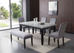 A shimmering marble top is the centerpiece of this elegant and functional dining set. Paired with ultra-comfortable velvet chairs and a bench, the Napoli dresses up a dining room without making it stuffy. Black finished solid wood legs complement the gray marble top in a neutral set that fits any environment while still commanding attention.