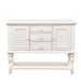 Invite cottage design into your dining room with the Summer House server. Crafted of poplar and rubberwood solids, this piece features a dove grey finish, full extension drawer glides for easy access to storage, fancy louvered panel accents on the two doors, bead molding framing on the drawers and doors, one adjustable shelf behind each door for user customization, three drawers, a felt lined silverware tray, wooden knob hardware, and is accented by beautifully round turned legs. Users can enjoy the added storage and convenience added by the bottom shelf, perfect to display items. This piece is available in an alternate finish, sure to be great addition in any space.