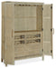 Escape the stress and extend hospitality to others with the resort-inspired Surfrider Bar Cabinet, featuring two bi-fold rattan doors, four drawers with self-closing drawer guides, two pull-out work surfaces, four pull-out wine shelves and eight stemware racks. Crafted of Pecan Veneers, Rattan and glass, the bar cabinet is finished in features the light natural Driftwood finish with distressing including sandblasting and bleaching. Lights are activated by a three-intensity touch switch.