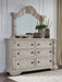 | Details | Includes dresser and mirror, Dresser made with hardwood solids, oak and ash swirl veneers, MDF substrates and cast resin components, Mirror made with solid wood, Antiqued white finish, Hardware with antiqued bronze-tone finish, 6 smooth-gliding drawers with fully finished interiors, English dovetail construction and heavy-duty ball-bearing side glides (top drawers felt lined), Mirror attaches to back of dresser | |