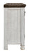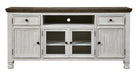 Have your fill of modern farmhouse style with this TV stand. Its distressed two-tone finish pairs a vintage white with a weathered gray for a look that’s utterly charming. Right and left cabinets open to reveal adjustable shelving for all your entertainment center storage needs. Center glass doors add to its relaxed appeal.