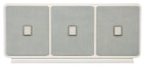 Serene and stylish with a spa-like color scheme, the modern Atlantis Entertainment Credenza has rounded corners on a rectangle shape, raffia-wrapped door fronts and a creamy white plinth base, sides and front. Dramatic square-shaped hardware is silver-colored metal with white painted glass. The three doors have soft-close hinges and magnetic door catches with one adjustable shelf behind each door, a ventilated back panel and a three-plug electrical outlet behind the middle door. The pale blue tone of the raffia-wrapped doors is inspired by Caribbean beaches.