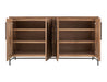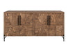 4 Door Console. The Verona console combines sculptural elegance, making it a versatile addition to any space. Constructed with a solid mango wood frame and mortise-and-tenon joinery, it offers both strength and artisanal quality. The doors and top are made from engineered ash wood, featuring a bold geometric pattern that showcases the natural wood grain. In contrast, the slim metal base adds a contemporary touch. Custom metal pulls provide a subtle yet refined finishing detail. This console also features an innovative storage solution, complemented by four shelves designed for optimal organization and style.