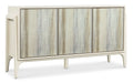 Crafted of Maple Veneers in a serene Almond White finish with reverse painted-glass door fronts in brown, gray and purple tones, the Hera Credenza is a stylistically versatile piece with functional appeal. The three doors have soft-close hinges and touch latches. The left and center door both have one adjustable/reversible wood shelf with wine bottle storage option. Each shelf will hold up to 4 bottles. Wire management and ventilation is offered behind both the left and center doors. The right door has two drawers, and the bottom drawer is a file drawer.