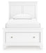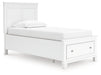 | Details | Includes panel headboard, storage footboard, rails and roll slats , Made with hardwood solids and MDF substrate, Side rails feature laminated solid hardwood slat support rails (or LVL) with glued and screwed blocking for added strength , White painted finish, Round metal drawer knob with satin nickel-tone finish, Tapered feet, Smooth-gliding drawer in footboard , Bed does not require additional foundation/box spring; accommodates most zero clearance adjustable bases with the addition of a bunkie board , Mattress available, sold separately, Assembly required | |
