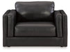 Keen on crisp, contemporary design? Adore the pleasure of leather? Look no further. This oversized chair satisfies on every level. Richly textured and decadently supple, the plush cushions are wrapped with expertly matched leather and faux leather upholstery in an on-trend onyx tone. Sleek double-padded arms and a low, clean-lined profile complete the chair's simply chic appeal.