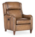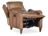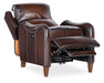 Elevate your living room with the Carrington Power Recliner by Hooker Upholstery. This luxurious piece, upholstered in semi-aniline leather, epitomizes transitional style with its rich hue and sleek silhouette. Boasting both power recline and a power headrest, it offers customizable comfort at your fingertips. The recliner features tapered wood legs, a bustle-style back, and sloped arms, ensuring both elegance and ergonomic support. Ideal for spaces seeking a blend of sophistication and functionality. Embrace luxury living with this meticulously designed recliner that seamlessly integrates into any modern home decor.