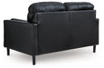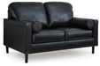 This loveseat embodies timeless mid-century elegance with its linear design, sleek track arms and tapered legs. Skillfully matched leather and faux leather upholstery adds a luxurious touch to the overall look. Experience endless style opportunities for today's living spaces.