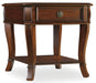 In a classic casual silhouette with a rich cherry finish with distressing and antiquing and a decorative veneer top, the Brookhaven End Table features one drawer and one shelf and refined details like a brass-finished medallion drawer pull and curved, fluted legs.