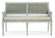A fresh take on vintage design, the charming Charleston Bench is crafted of wood and accented by cane on the back and inside and outside arms. Featuring intricately-shaped legs, the piece is finished in Haint Blue, a soft color which can be found on the ceilings of porches and entryways, window shutters and doors in the American South, dating back more than 200 years from the Gullah folklore that held the color kept “haints” or spirits from entering homes and dwellings. The cushion is upholstered in the Oyster performance fabric for stain resistance and cleanability.