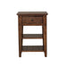 Accent your space with the casual country style Lake House chair side table. Crafted of poplar solids and oak veneers, this piece features an appealing planked top, two open planked shelves, simplistic wood and peg accents, one drawer accented by antiqued brass knob hardware, anchored by a tapered leg design. The golden oak finish allows for a universal appeal.
