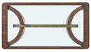 Classy and timeless, the Contours Cocktail Table combines Walnut Veneer, champagne accent trim and a white tempered and beveled glass insert on the wood-framed top. With champagne-finished accent trim, legs and a stretcher, it has a rectangle shape and measures 66 inches wide by 36 inches deep.