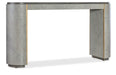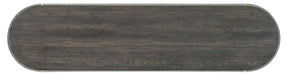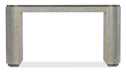 With the design flair of a luxurious fashion accessory, the Dylian Console Table has a gray crocodile exterior with gold metal accents and a dark wood top and base. Crafted of Pine Veneers and Robus Leather, it has an oval shape and measures 64 inches wide by 16 inches deep.