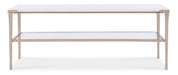 Add elegance and functionality to your living space with the Jen Table from the Melange collection. This rectangular table features a stone top supported by slim, tapered metal legs, offering a sleek and modern design. A convenient glass shelf provides additional storage or display space. Perfect for transitional or contemporary decor, this table blends timeless materials with clean, minimalist styling.