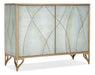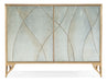 With a delicate organic look, the Joannie Chest has silver leaf eglomise doors featuring a lacey etched pattern, accentuated by a gold frame and base and gray painted interior. The two doors have soft-close hinges and touch latches, with one adjustable shelf behind the pair of doors and a ventilated back panel.