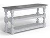 Sofa Table. Exuding farmhouse chic with just the right touch of old-world charm, the Stone Collection is meticulously crafted from solid pine wood. The wood is lightly distressed, showcasing a white finish and complemented by weathered gray tops.