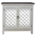 Transform your home with the Westridge accent cabinet. Crafted of Eucalyptus solids and Ash veneers in a wire brushed finished gray with white dusty wax and worn wood top. Features mirrored doors with decorative floral pattern overlays, block feet and one concealed fixed shelf behind doors. A unique piece that will work with any décor from traditional to contemporary.