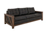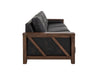 Wooden Frame, Upholstered Sofa. Step into comfort and make this loveseat the focal point of your living room. The Walnut loveseat features a sturdy wooden frame with a rich brown finish and wide, flat armrests. Both the seats and backrest are upholstered in a dark, leather-like material. The backrest showcases a tufted design adorned with buttons, adding an elegant touch. Diagonal wooden supports on the sides enhance its modern rustic charm, blending the warmth of wood with the sleekness of dark upholstery.